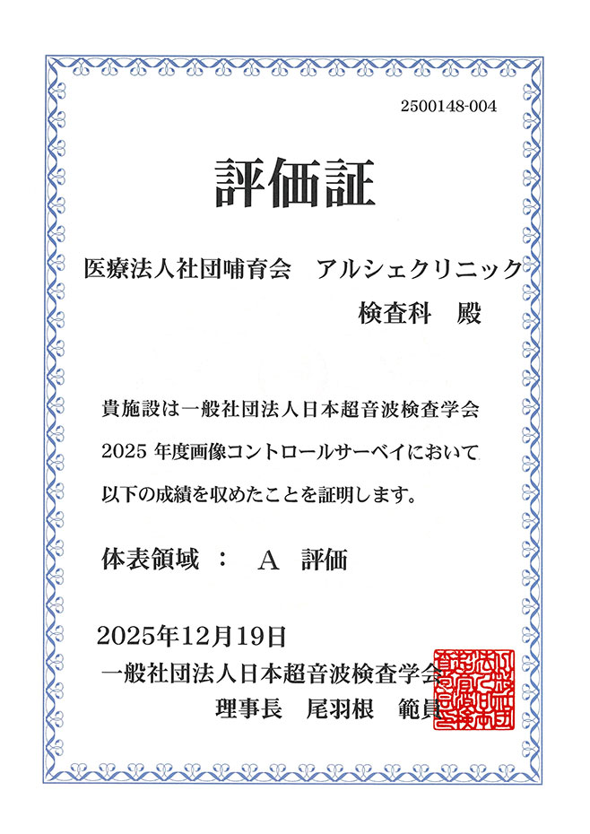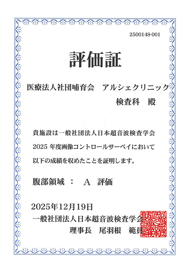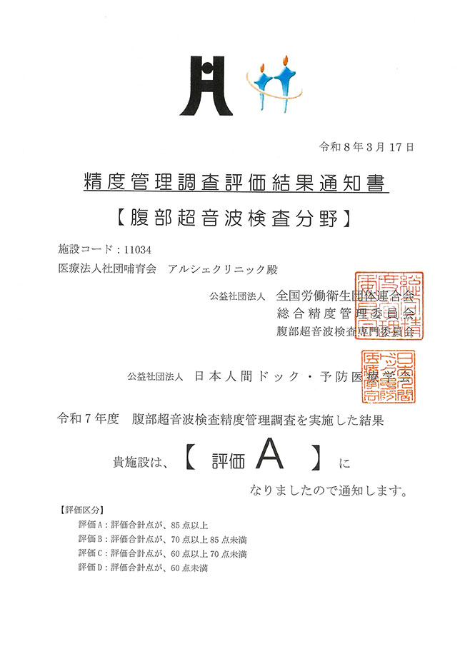 当クリニック検査科では2022年3月に全国労働衛生団体連合会での腹部超音波検査精度管理調査による「A評価」を取得ました。また、日本超音波検査学会による画像コントロールサーベイにおいても「A評価」を受けております。今後もこの評価を維持できるよう、日々努力して参ります。